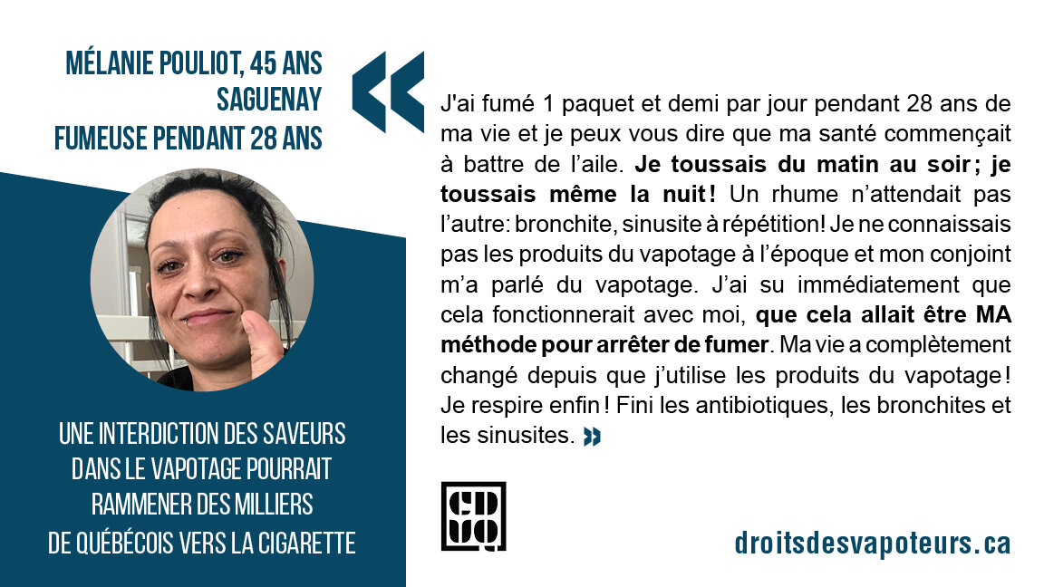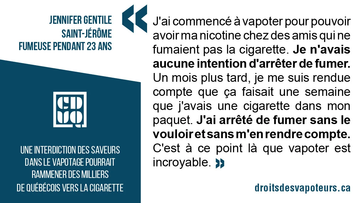 En abolissant les saveurs dans le vapotage en octobre dernier, le gouvernement du Québec a fait en sorte que des milliers de fumeurs qui avaient arrêté de fumer grâce au vapotage risquent fortement de retourner à la cigarette en plus d’enlever à ceux qui voulaient arrêter de fumer, un moyen efficace de cessation tabagique reconnu par Santé Canada. Au cours des dernières années, la CDVQ a fait parvenir au gouvernement de nombreuses études montrant que le vapotage constitue le meilleur moyen d’arrêter de fumer et, par le fait même, de sauver des vies. La dernière chose que les anciens fumeurs veulent comme saveur pour vapoter est celle du tabac.