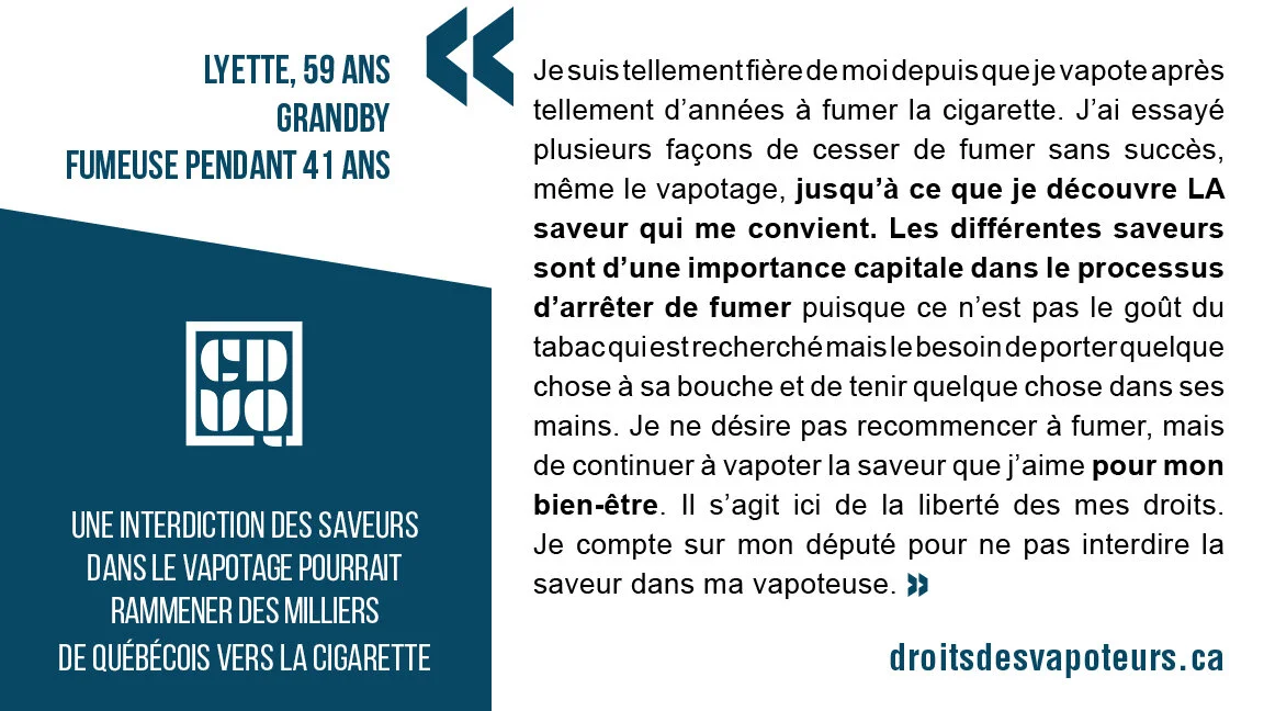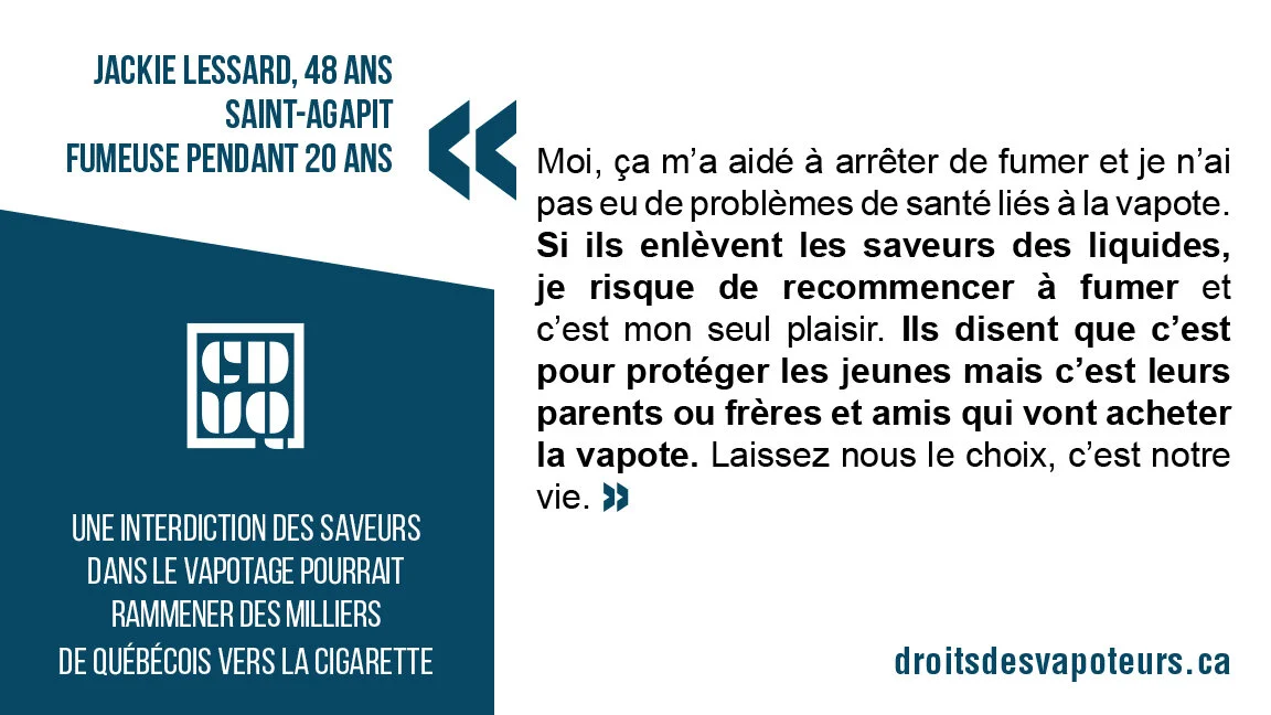 Le gouvernement nous parle souvent d’un Québec sans tabac. Nous sommes d’accord puisque c’est la raison d’être de notre organisme. La CDVQ regroupe presque exclusivement des membres qui ont choisi le vapotage pour arrêter de fumer. Avec son nouveau règlement sur l’abolition des saveurs, le gouvernement a fait reculer la cause de 10 ans. Plusieurs vapoteurs vont retourner à la cigarette et ceux qui voulaient arrêter, seront privés de cette alternative de cessation tabagique efficace.